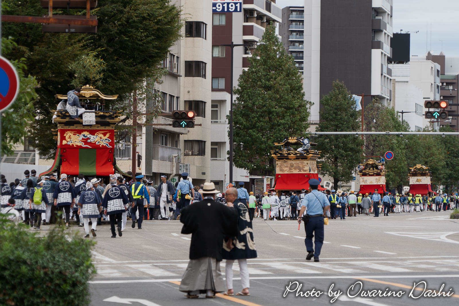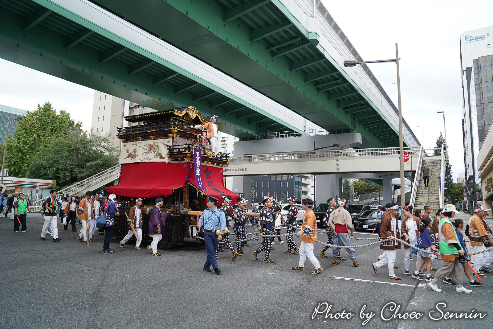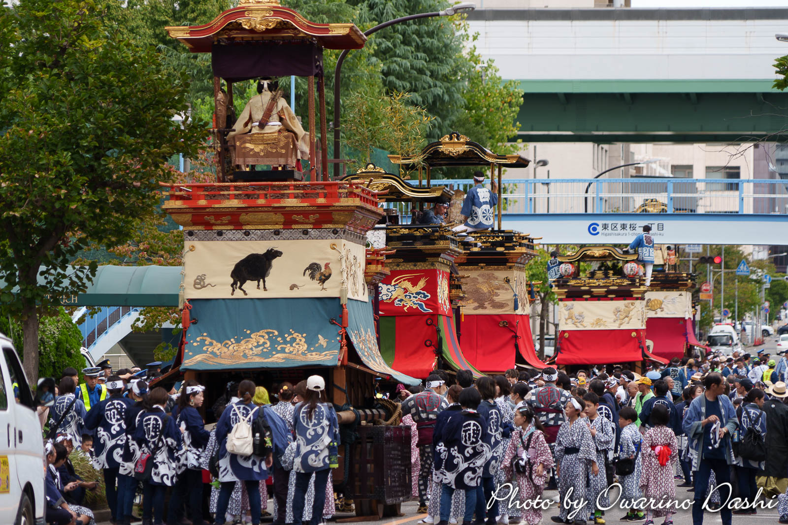 栄交差点で名古屋まつり山車揃終了後に東桜小学校北側で休憩した東区の山車5輌です。