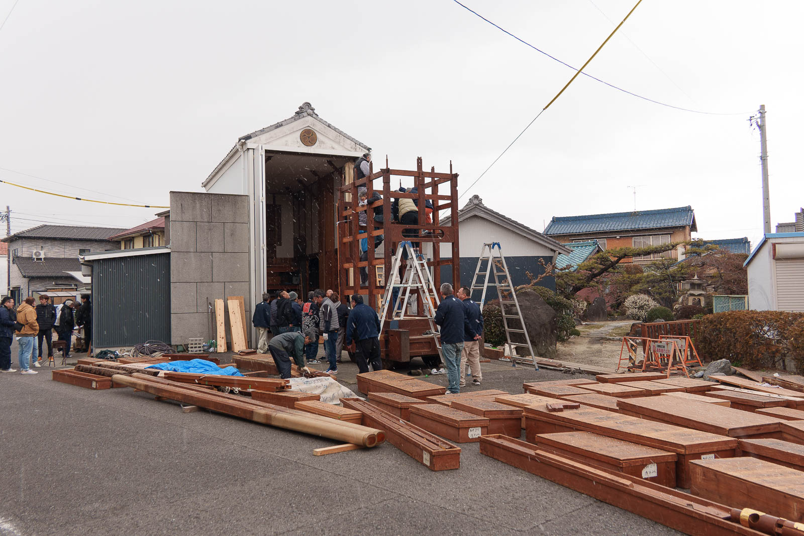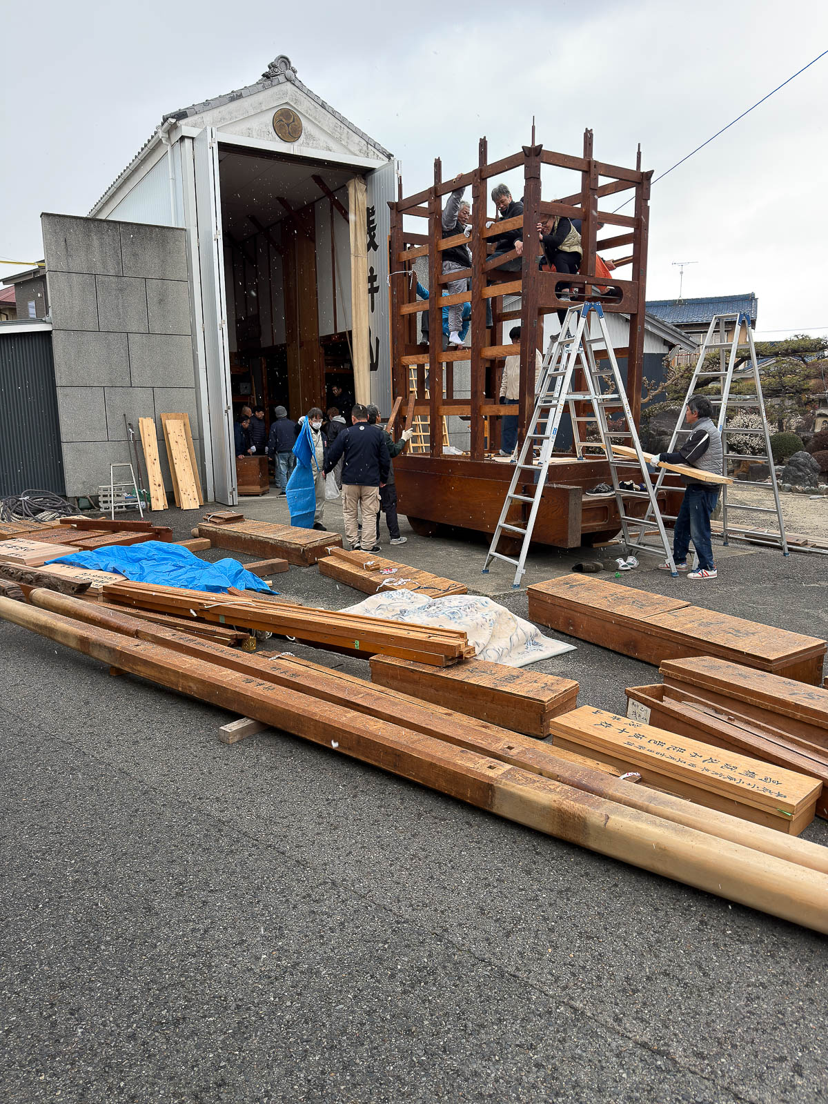 2月8日、浅井山宮本車の組み上げでした。朝方は雪が降るという寒さでした。