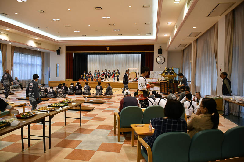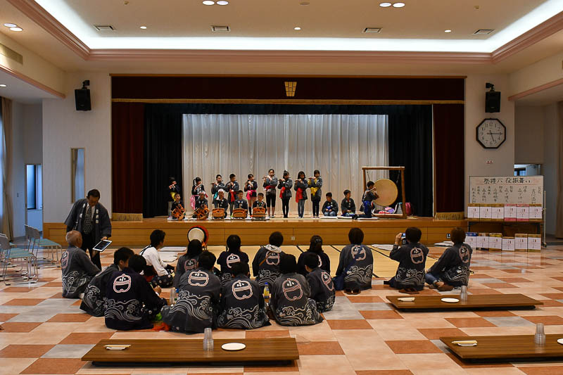 鈴渓会館のホールで子供さんの囃子発表です 例年だと外で寒さに震えながら聴いていたんだけど こんな気候なら外でもいいぞって思ったりして いやソレを言うのはよそう 来年寒かったら困るし ごちそうもあるしね・・・・
