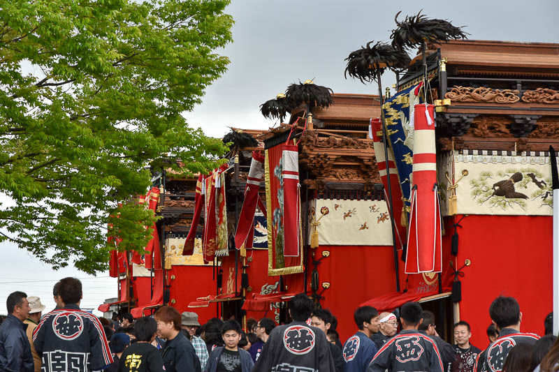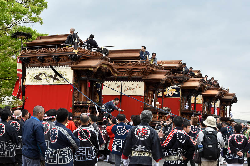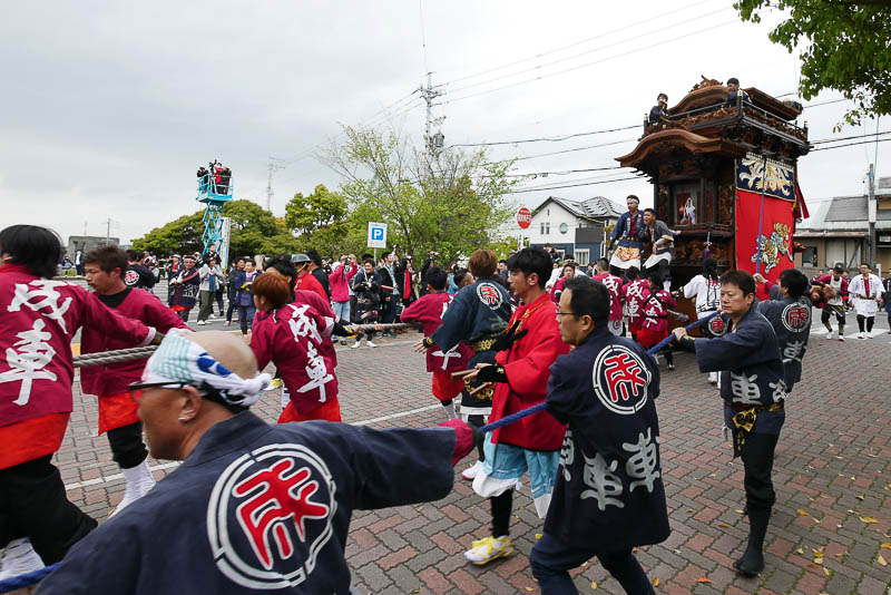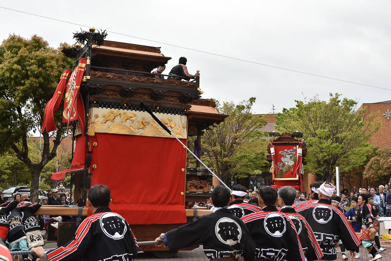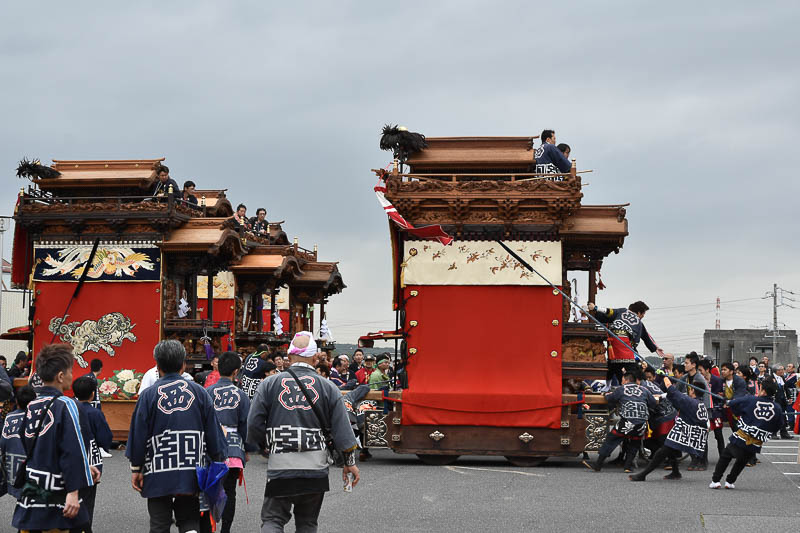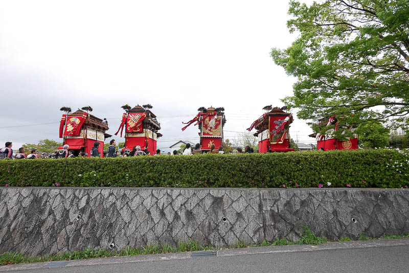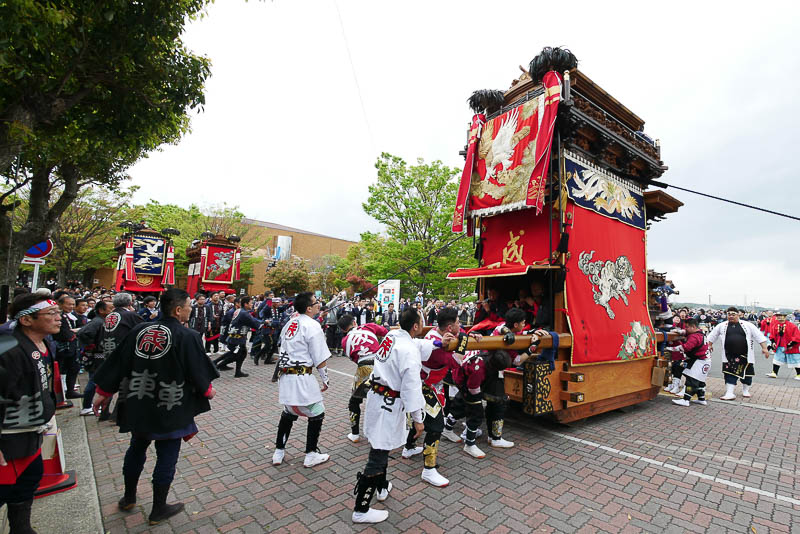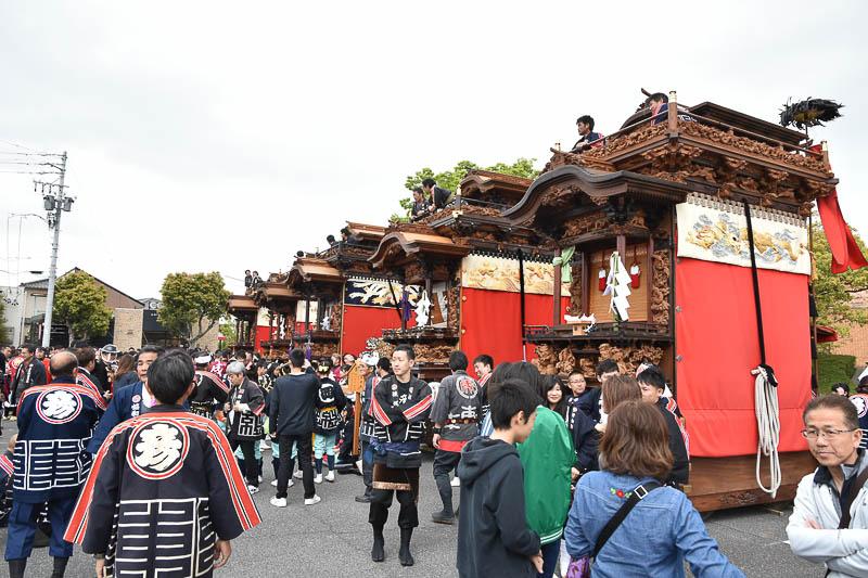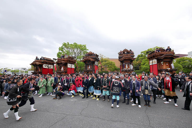 左から協和地区砂子組白山車、同西組協和車、成岩四区北村組成車、西成岩地区西組敬神車、同彦洲組日之出車