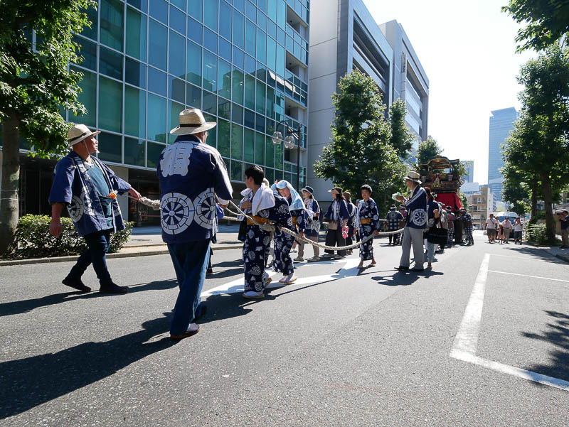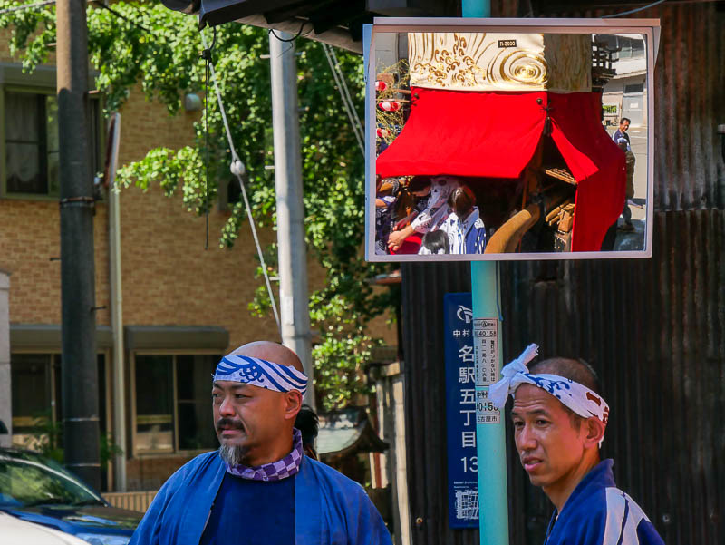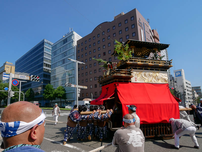 猛暑の午後2時40分に中村区名駅5丁目を曳き出された二福神車は那古野神社、東照宮などにからくり人形を奉納し、提灯を点灯し帰途につきました .