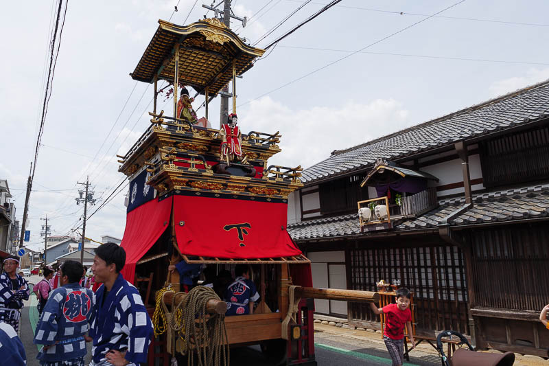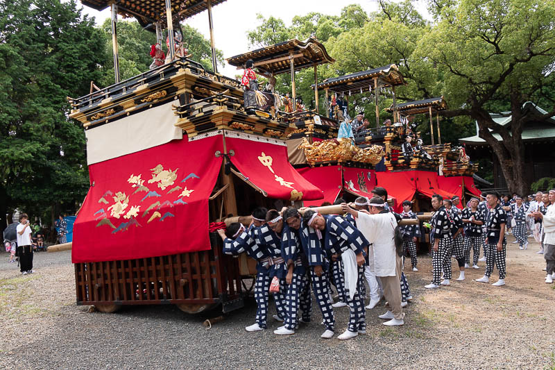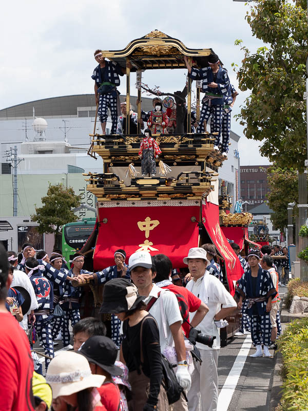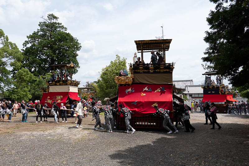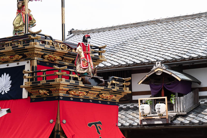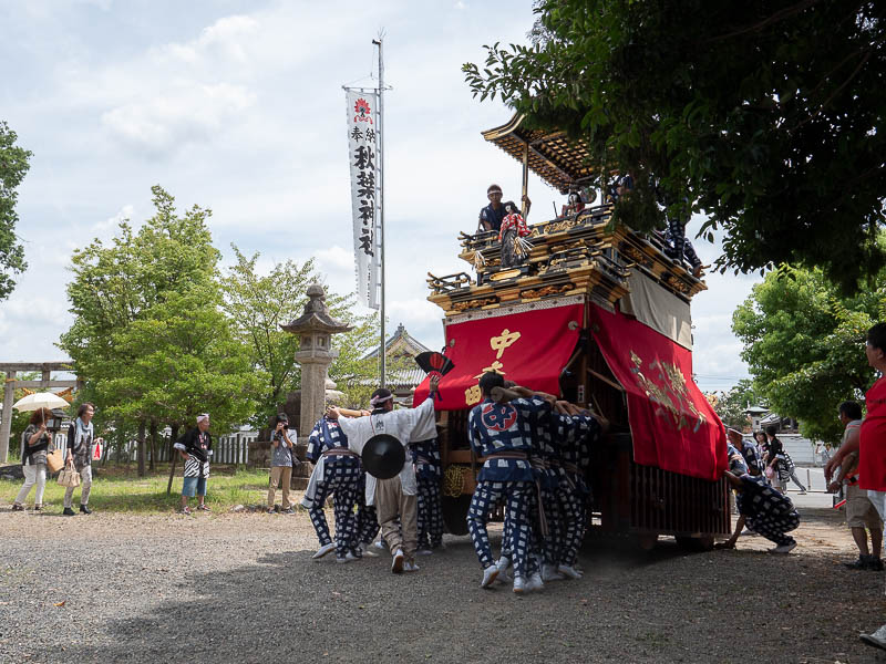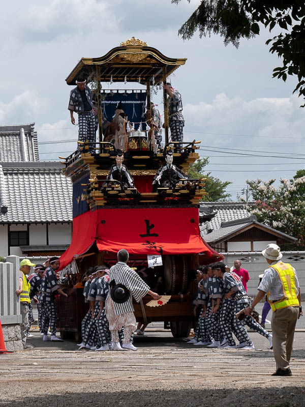 屋根神様の前でからくりを奉納する下本町西王母車です