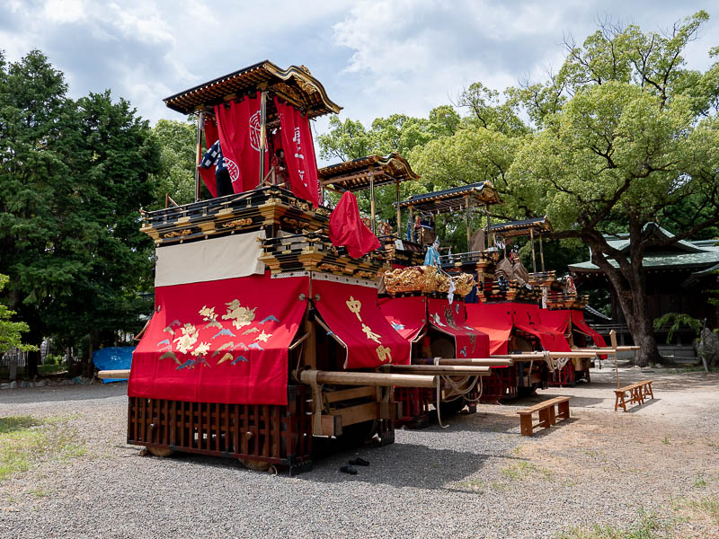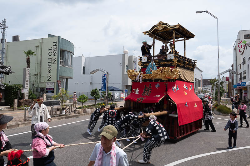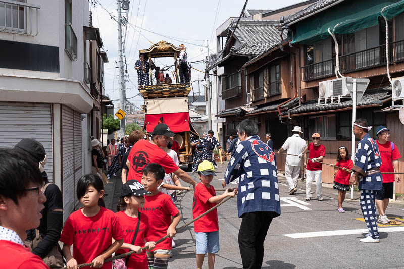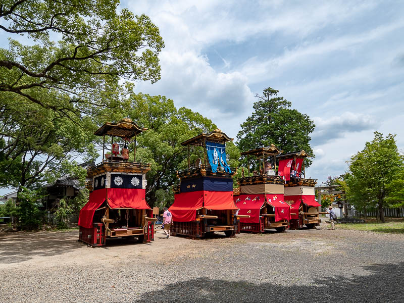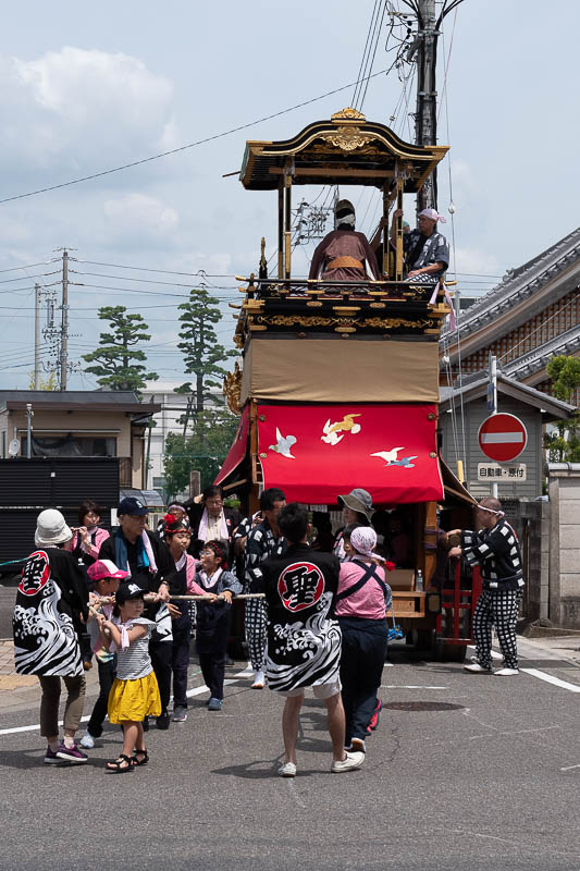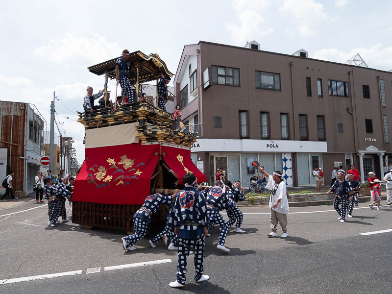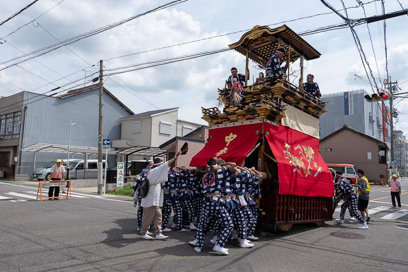 屋根神様の前でからくりを奉納する下本町西王母車です