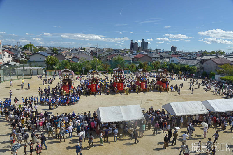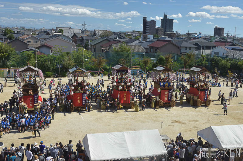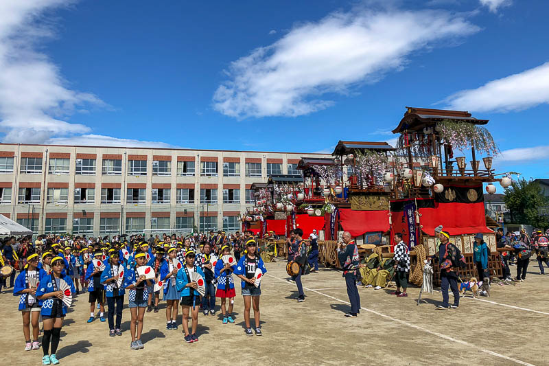 校庭に5輛の山車が整列いました