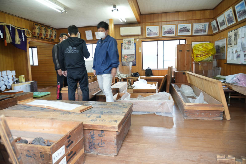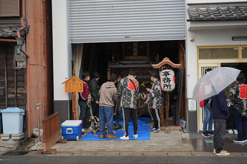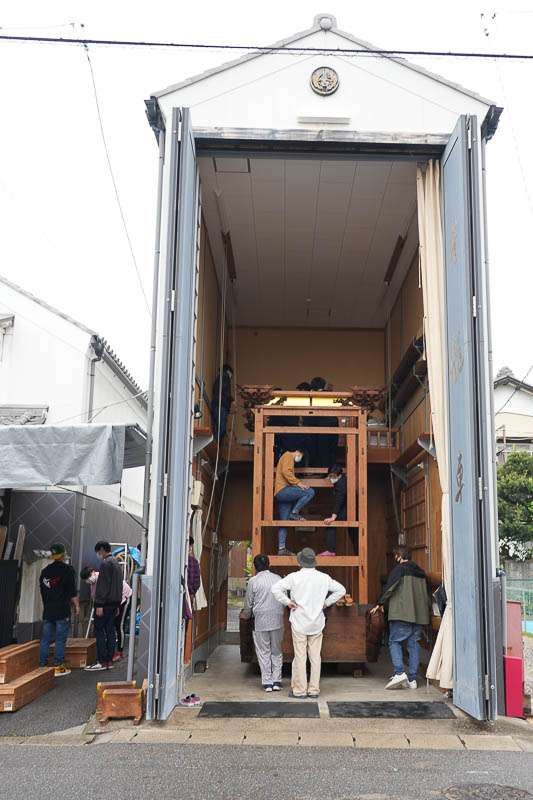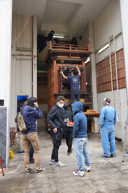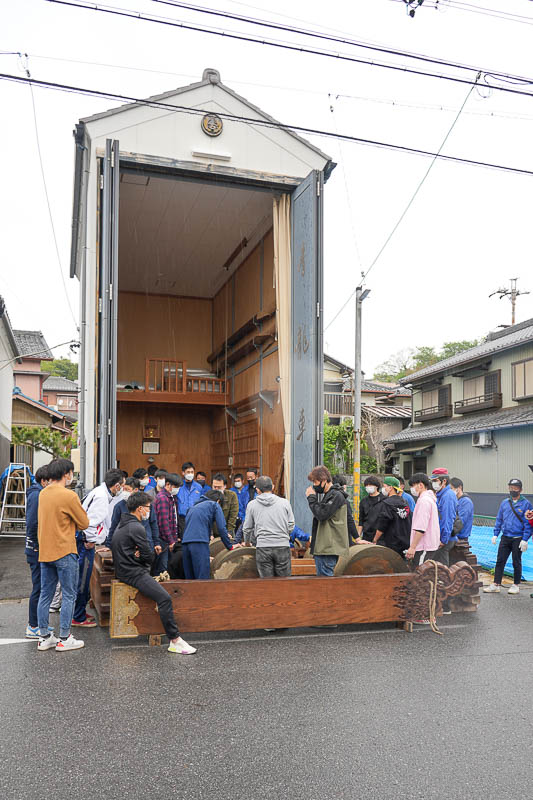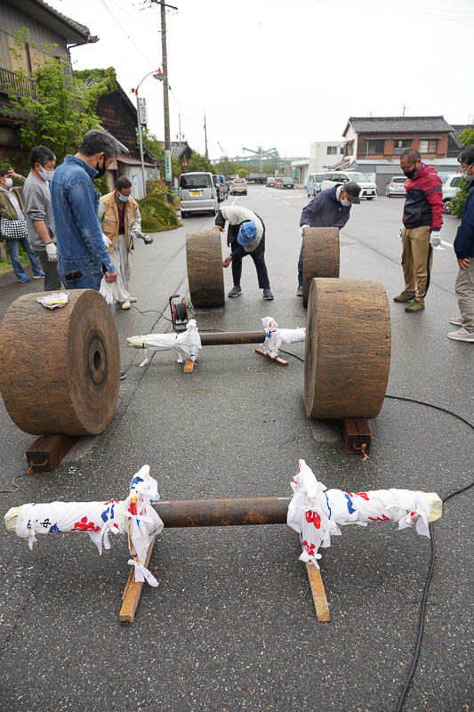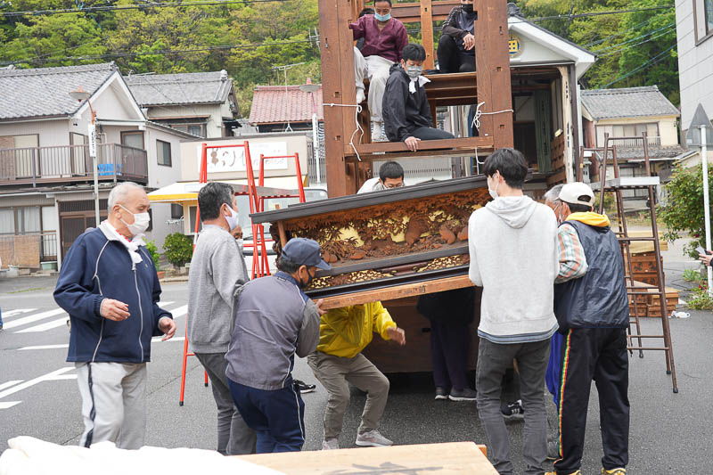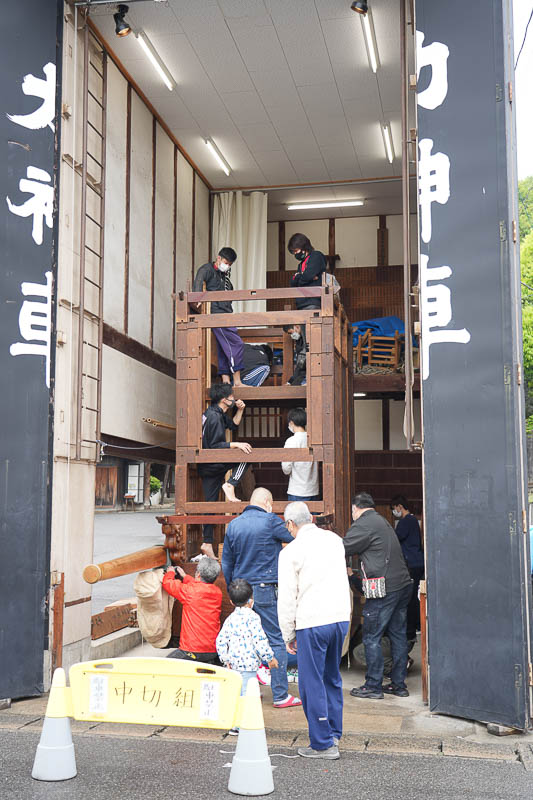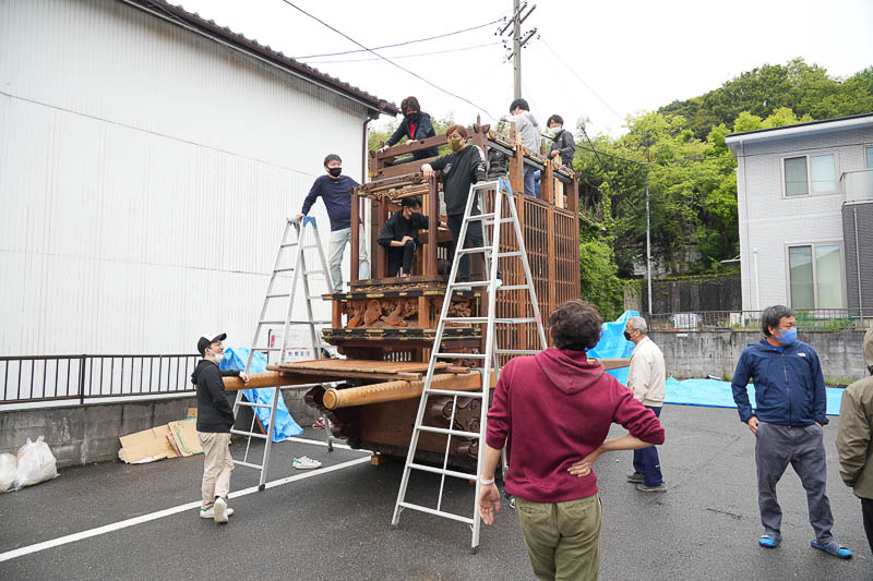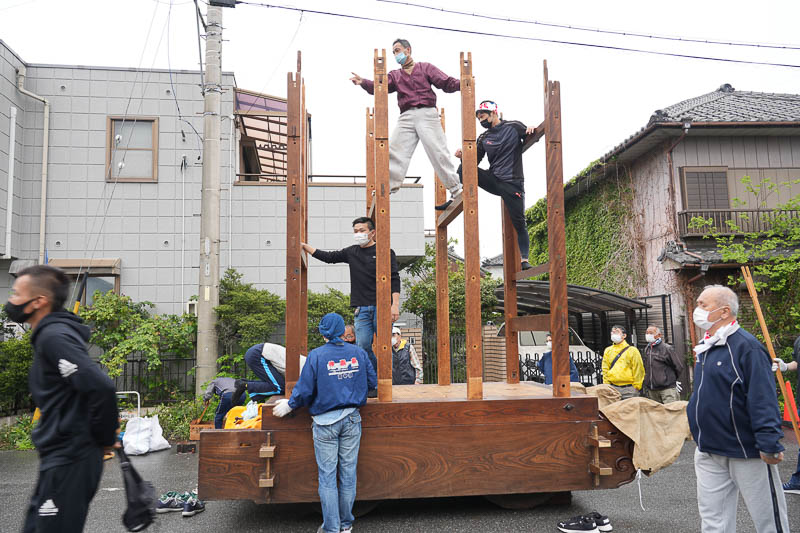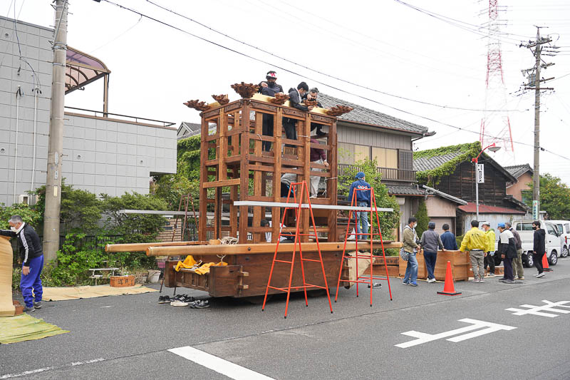 ハッキリしない空模様の17日、5月4日の潮干祭を前に各組では山車の組み上げが行われました。