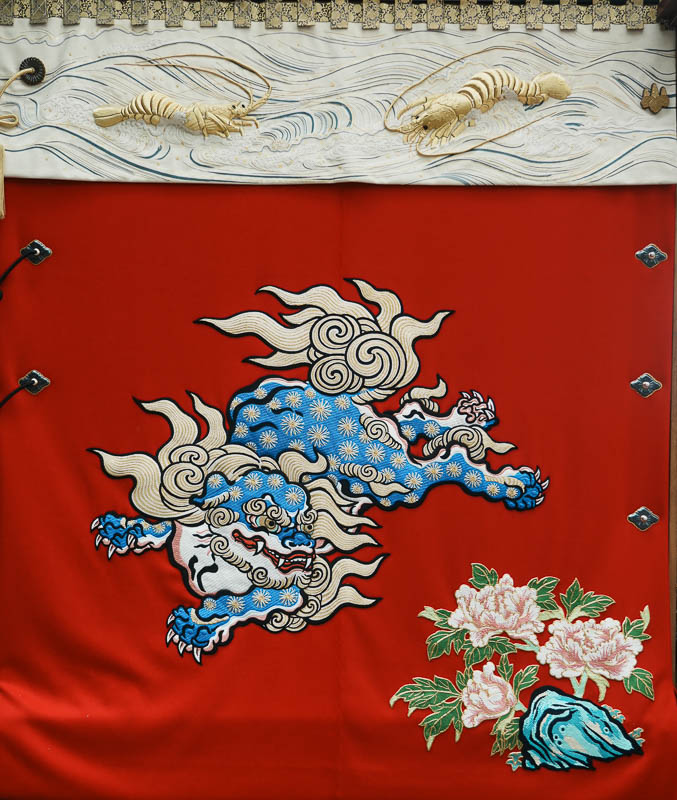 大幕は緋羅紗に「阿吽唐獅子常石牡丹」の刺繍で彩られています。