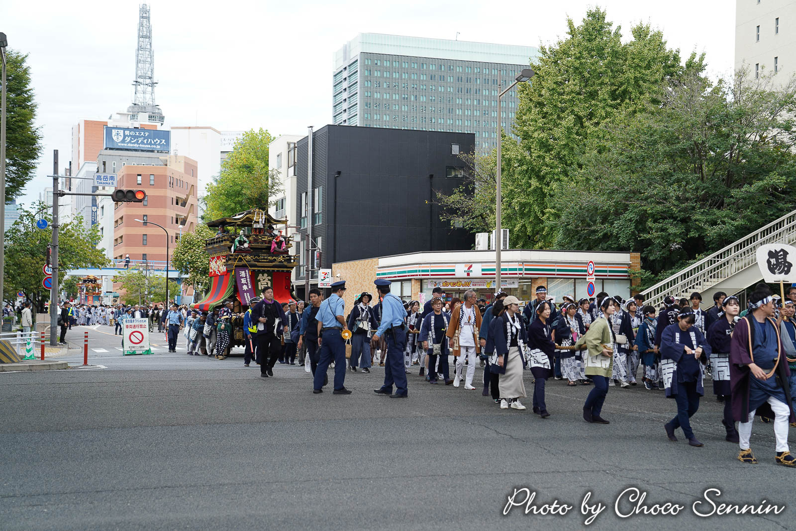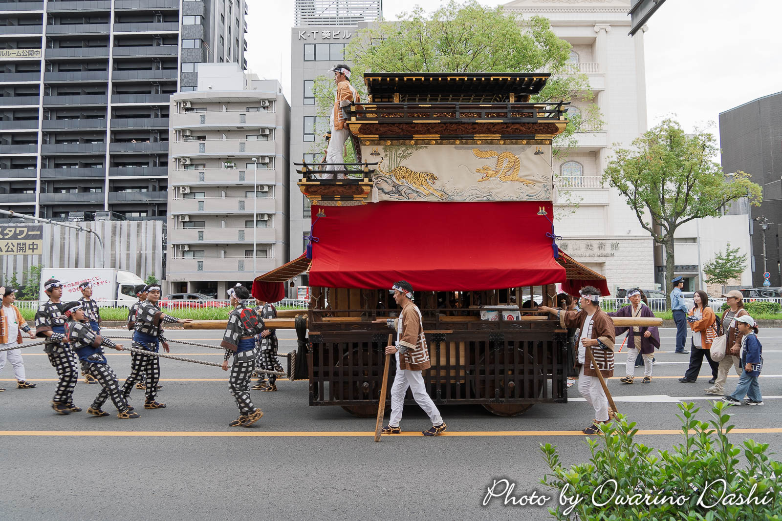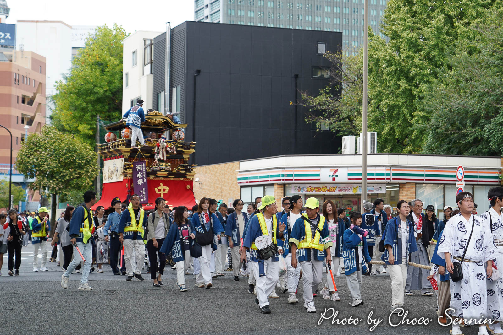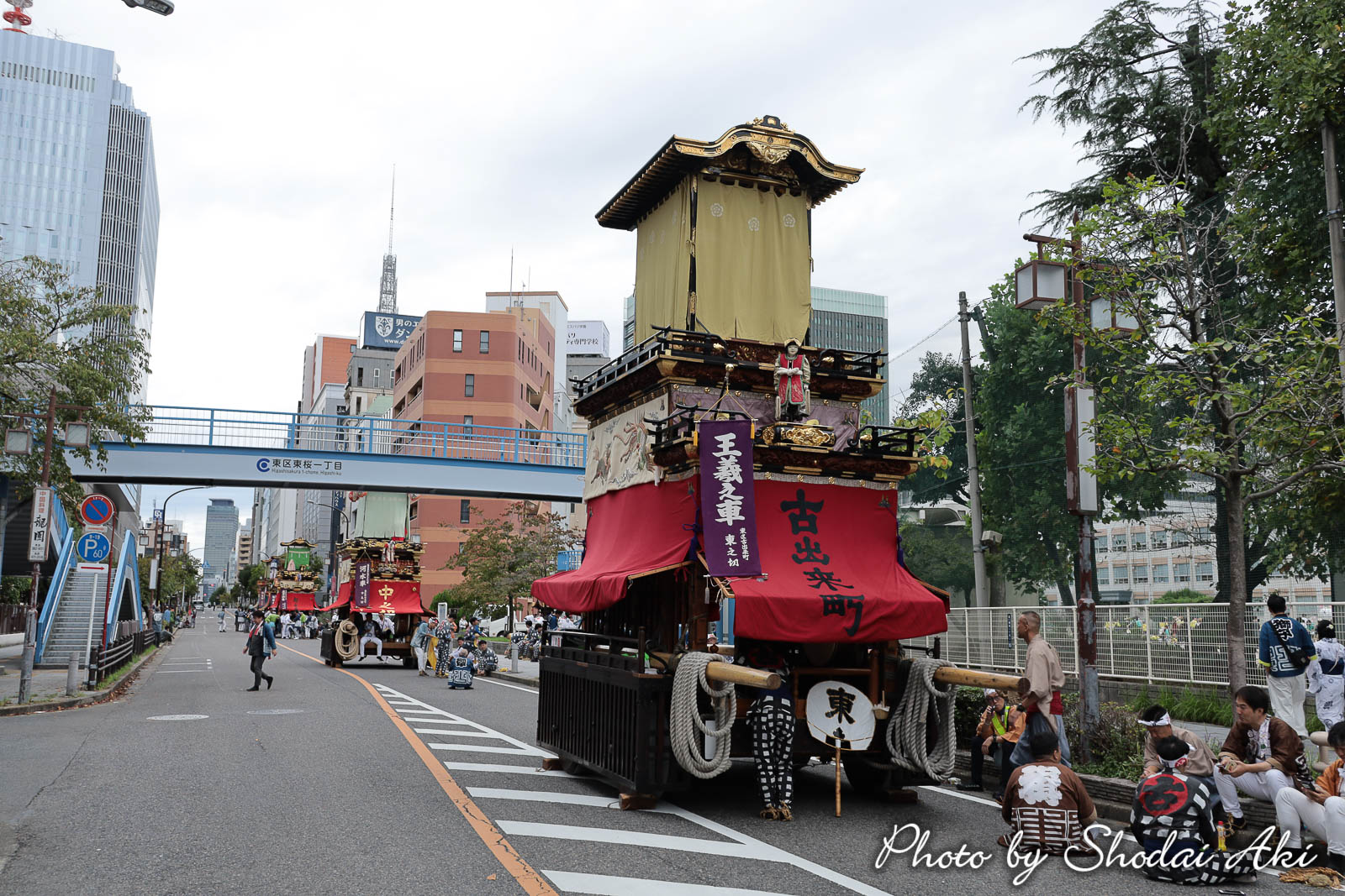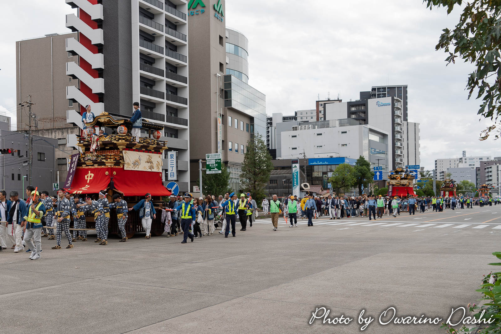 栄交差点で名古屋まつり山車揃終了後に東桜小学校北側で休憩した東区の山車5輌です。