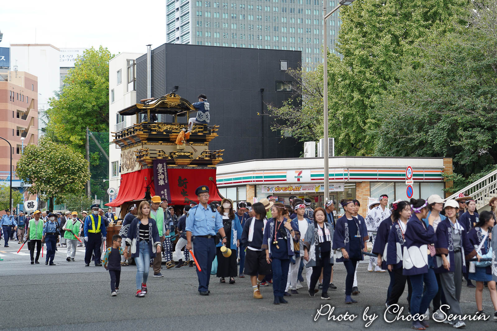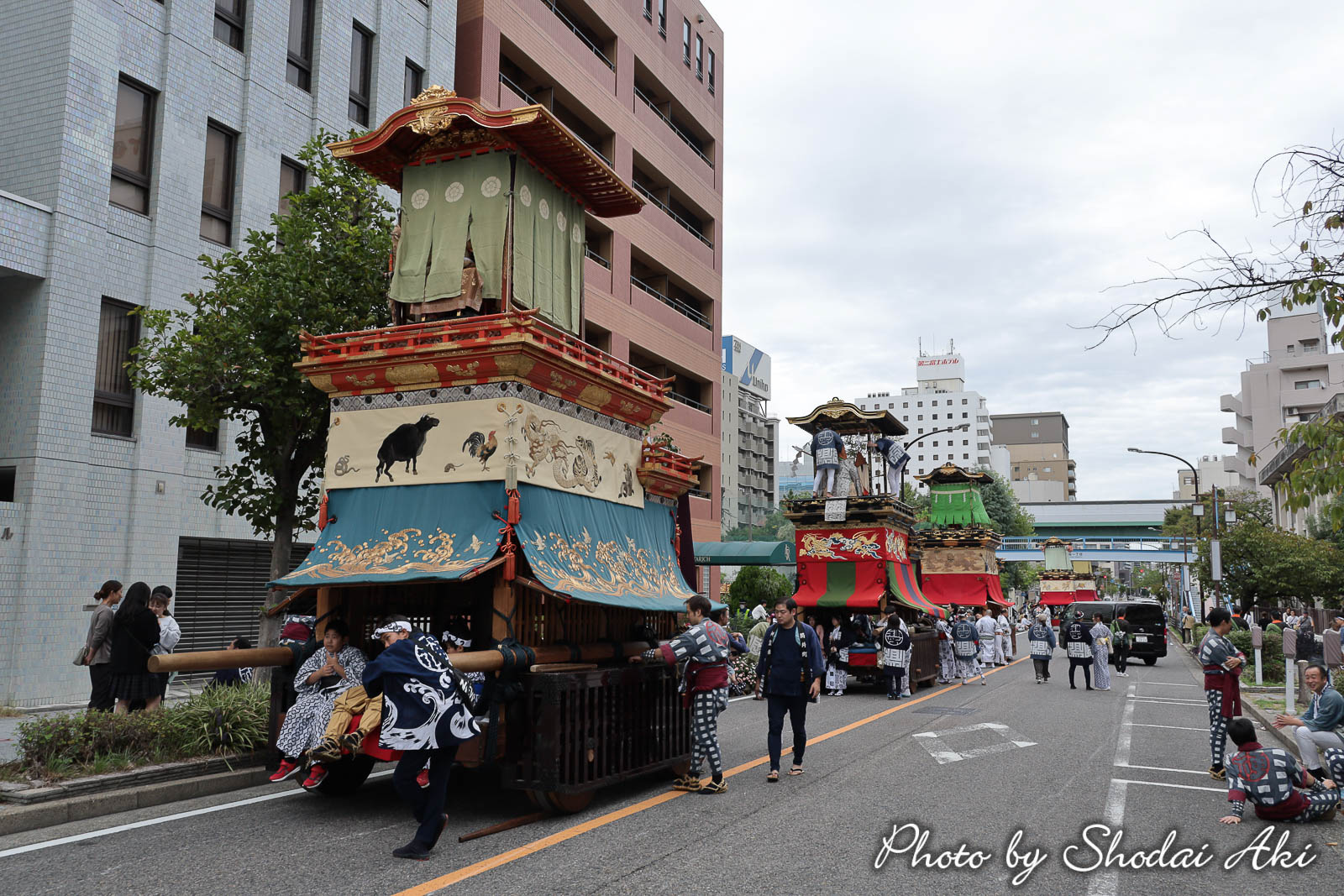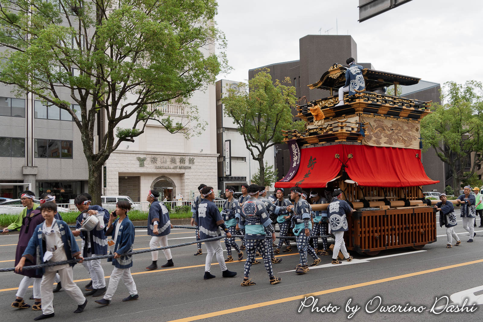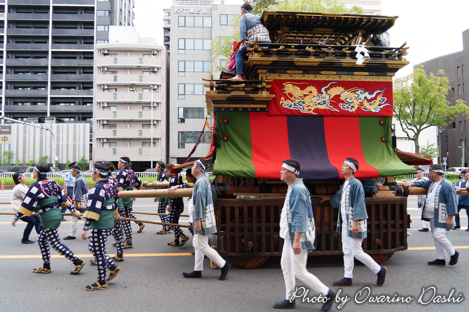 栄交差点で名古屋まつり山車揃終了後に東桜小学校北側で休憩した東区の山車5輌です。